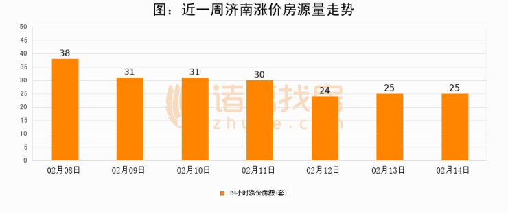 根据诸葛找房数据显示,济南24小时涨价房源量为25套,较02月13日持平。
