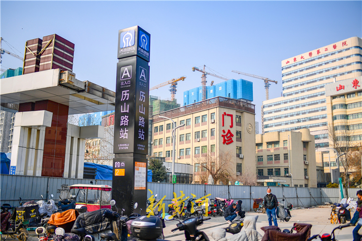 在多个站点的地上出入口周边,道路逐步恢复通行,烟台路、张庄路原来的瓶颈路一并打通,同时新增了公交车停车场、非机动车停车场、社区公园。在北园站和历山路站,两个站点相隔距离最近,出入口最近处相隔只有400多米,如今,两个入口之间空地进行了绿化和道路建设,种植苗木花卉的同时修建了步行道路,并将原来绿色的施工围挡更换为城市文明标识的绘画墙,形成长约百余米的小公园。在靠近历山路站的区域,则铺设大片的沥青路面,喷画了停车标志线,将作为公交站场使用。
