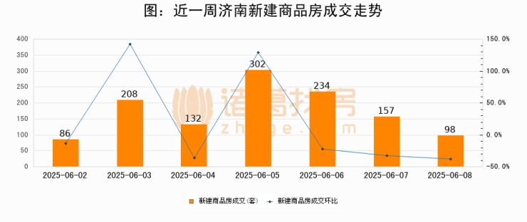 根据济南市住房和城乡建设局数据显示,2025年06月08日济南新建商品房成交98套,较昨日减少59套,环比下降37.6%。近一周济南新建商品房日均成交174套。06月08日单日成交98套,低于近一周平均水平43.7%。