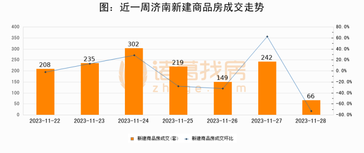 根据济南市住房和城乡建设局数据显示,2023年11月28日济南新建商品房成交66套,较昨日减少176套,环比下降72.7%