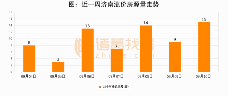 根据诸葛找房数据显示,济南24小时涨价房源量为15套,较09月09日增加6套,环比上涨66.7%。与此同时,涨价房源占比小幅扩大,业主信心有所提升。