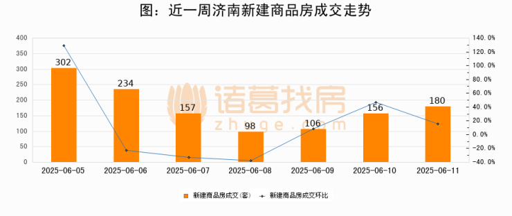 根据济南市住房和城乡建设局数据显示,2025年06月11日济南新建商品房成交180套,较昨日增加24套,环比上涨15.4%