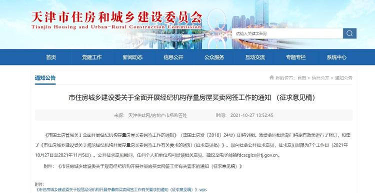 从天津市住房和城乡建设委获悉,天津市住建委日前发布《市住建委关于全面开展经纪机构存量房屋买卖网签工作的通知(征求意见稿)》,向社会公开征求意见。该征求意见稿对二手房的全交易流程进行了系统性规范。