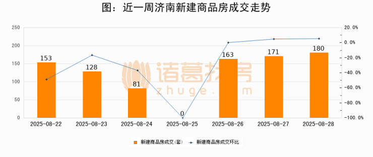 根据济南市住房和城乡建设局数据显示,2025年08月28日济南新建商品房成交180套,较昨日增加9套,环比上涨5.3%