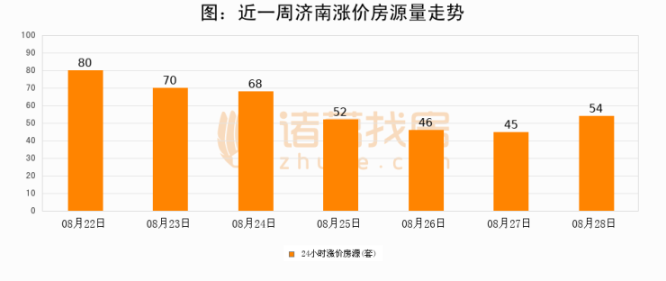 根据诸葛找房数据显示,济南24小时涨价房源量为54套,较08月27日增加9套,环比上涨20%。与此同时,涨价房源占比小幅扩大,业主信心有所提升。