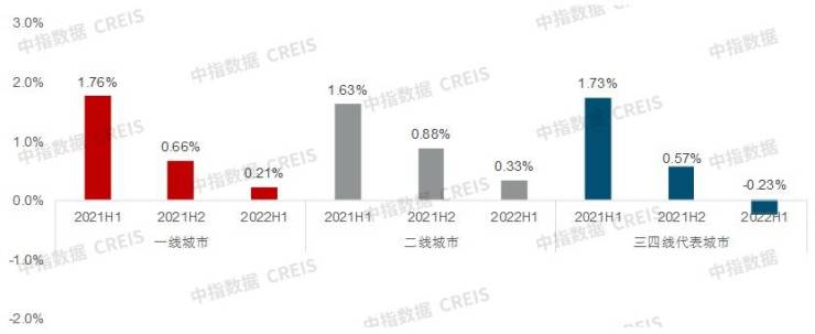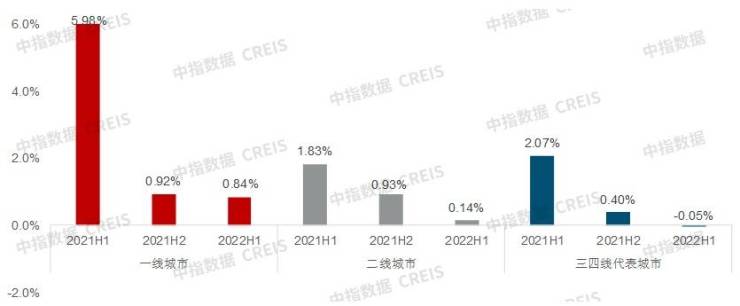 图:2021年至2022年上半年各梯队城市新建住宅均价半年度累计涨跌幅变化