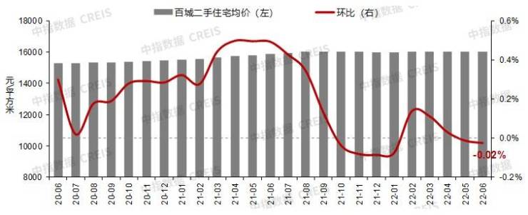 图:2020年6月至2022年6月百城二手住宅均价及环比变化