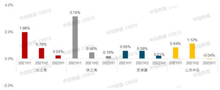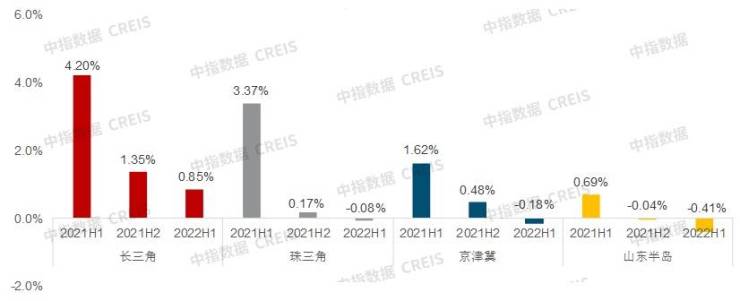 图:2021年至2022年上半年主要城市群新建住宅均价半年度累计涨跌幅变化