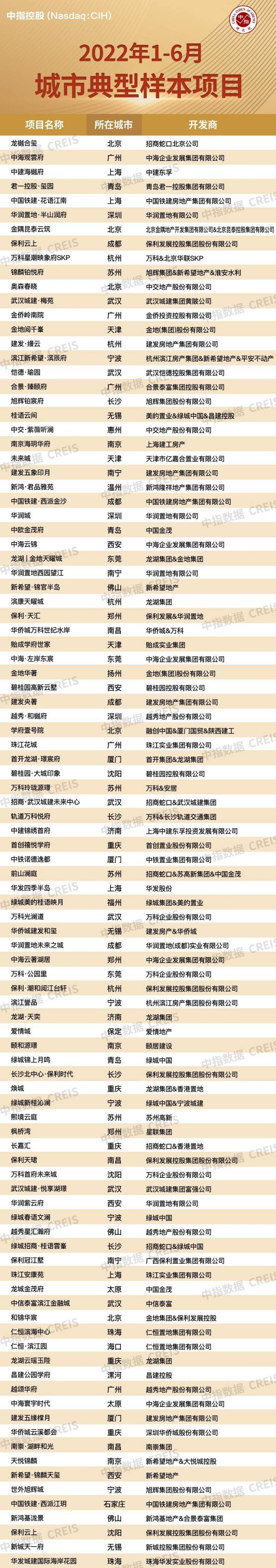 近期多城市出台楼市新政,在一定程度上可以提振购房者信心。对此,房企需抓住政策窗口期,对内强化产品硬实力,对外提升销售服务品质。在此背景下,中指研究院在中房指数系统理论体系和架构的基础上,从百城价格指数样本项目中选取城市中有较强知名度和广泛影响力的典型样本项目,以“典型性”为基本原则,从销售表现、项目品质、品牌实力等维度出发,对主要城市样本项目进行研究,得出“2022年1-6月城市典型样本项目”,为行业提供标杆典范。