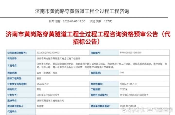 《公告》中显示项目建设单位为济南城港建设工程有限公司,据了解,济南城市建设集团有限公司委托子公司济南城港建设工程有限公司作为项目法人单位具体实施本项目。(齐鲁壹点)