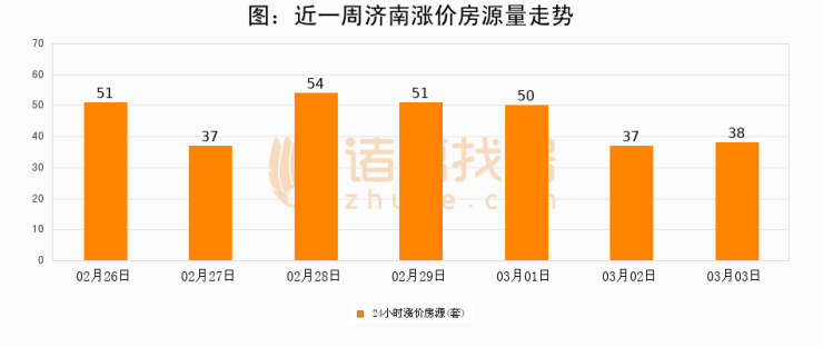 根据诸葛找房数据显示,济南24小时涨价房源量为38套,较03月02日增加1套,环比上涨2.7%。与此同时,涨价房源占比小幅扩大,业主信心有所提升。