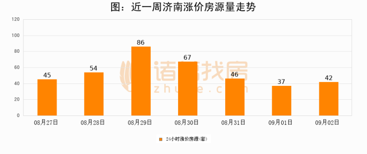 根据诸葛找房数据显示,济南24小时涨价房源量为42套,较09月01日增加5套,环比上涨13.5%。与此同时,涨价房源占比小幅扩大,业主信心有所提升。