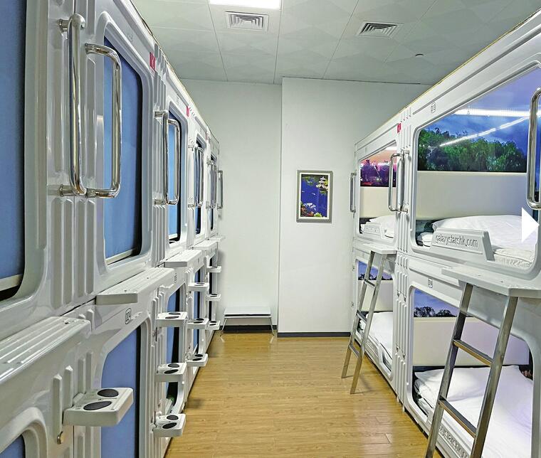 在一处狭长的走廊里,分设了几间大小不等的屋子,面积较大的屋子约50平方米,内设9个类似“太空舱”的上下床铺,面积最小的屋子约20平方米,内设4个“太空舱”。由于是上午时间,只有一个舱位有人,其余都是空置的。