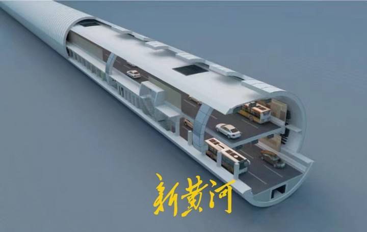新黄河记者了解到,黄岗路隧道采用单洞双层,通过一条盾构隧道,解决两个方向的车辆通行问题,布置双向6车道,上层通行南向北交通,下层北向南,设计车速60km/h,相比常规双洞隧道方案投资节约。