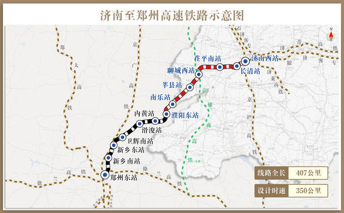 济郑高铁起自济南西站,途经山东省济南市、聊城市,河南省濮阳市、安阳市、新乡市、郑州市,接入郑州东站,线路全长407公里,设计时速350公里,其中濮阳至郑州段已于2022年6月开通运营。