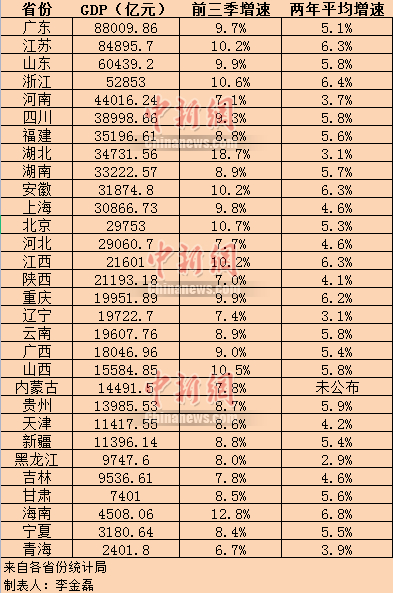 从GDP总量看,广东、江苏、山东前三甲的格局没有发生变化。广东和江苏前三季度GDP均突破8万亿元大关,呈现双雄争霸的态势。