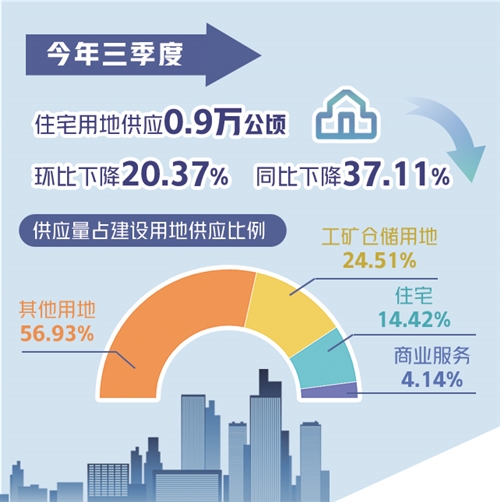 中国国土勘测规划院新近发布的全国主要城市地价监测报告显示,三季度住宅用地供应0.9万公顷,环比下降20.37%,同比下降37.11%,住宅用地供应同比增速为2015年以来单季较低。