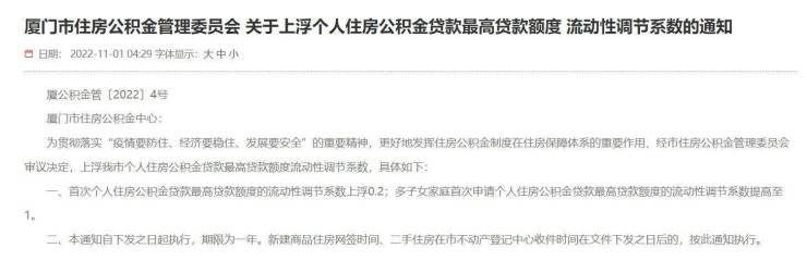 11月2日,澎湃新闻从厦门市住房公积金中心官网获悉,厦门市住房公积金管理委员会印发《关于上浮个人住房公积金贷款较高贷款额度流动性调节系数的通知》(简称《通知》)。