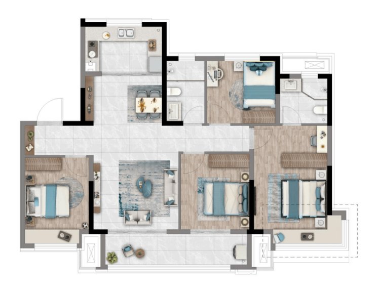 约128㎡则设计成了成长型户型,早期可以做为超大宽厅+超大阳台的大三室,等到有了二孩就可以将大宽厅隔出一间卧室,做成拥有客卧连厅大阳台的南向四面宽功能四室。整体设计做到了空间利用较大化,并且整体布局非常大气实用。