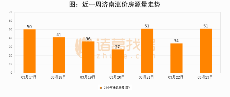根据诸葛找房数据显示,济南24小时涨价房源量为51套,较03月22日增加17套,环比上涨50%。与此同时,涨价房源占比小幅扩大,业主信心有所提升。