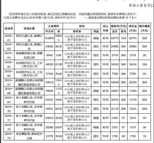 12月25日,章丘区国土资源局挂牌出让12宗地,面积697126平方米,约1045.7亩,总建面192万平方米。其中8宗为居住用地,建面97.7万平方米;4宗为商服用地,建面94.5万平方米。