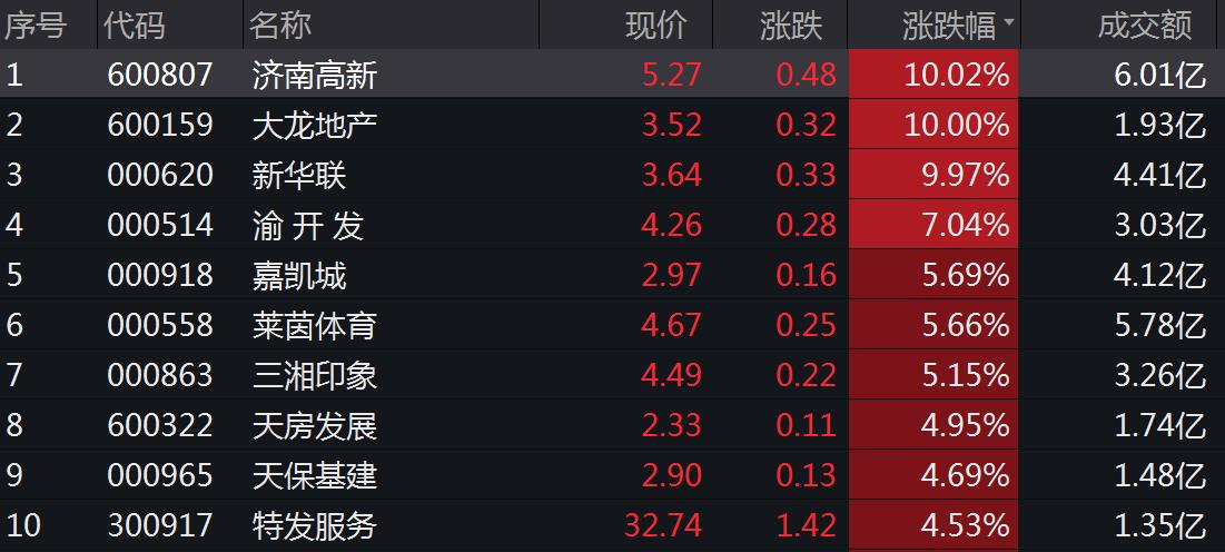 盘面上看,房地产板块表现较为亮眼,申万一级行业房地产指数盘中整体涨逾1%。个股方面,新华联六连板,股价站上3.64元创历史新高;大龙地产、济南高新涨停,渝开发、嘉凯城、三房发展、天保基建等盘中封板。
