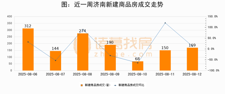 根据济南市住房和城乡建设局数据显示,2025年08月12日济南新建商品房成交169套,较昨日增加19套,环比上涨12.7%
