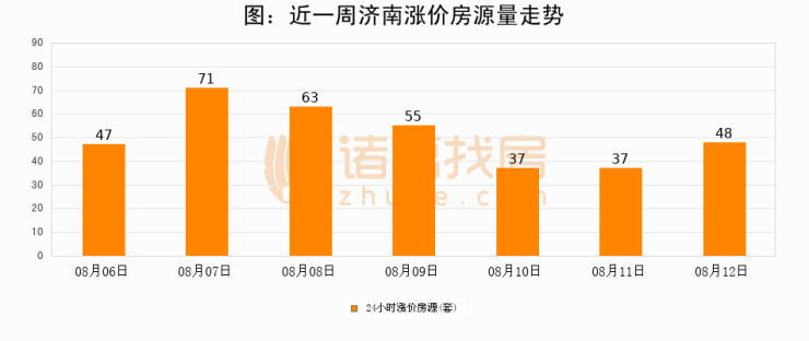 根据诸葛找房数据显示,济南24小时涨价房源量为48套,较08月11日增加11套,环比上涨29.7%。与此同时,涨价房源占比小幅扩大,业主信心有所提升。