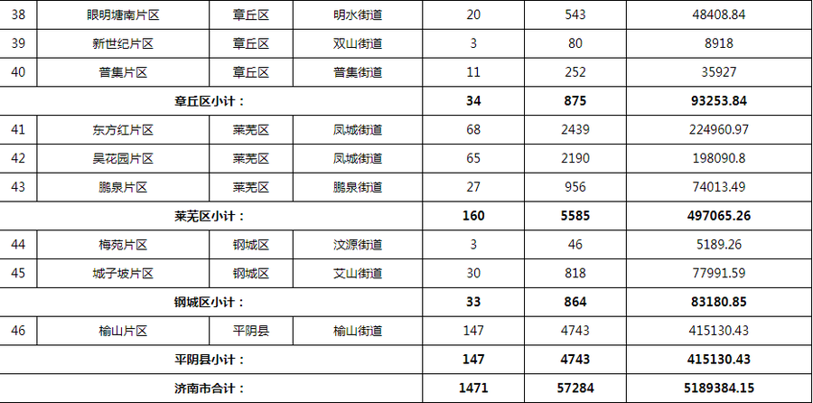 据悉,46个项目共包括426个小区,但相关小区详细名称尚未公布;改造计划共涉及居民57284户,楼栋数1471个,改造面积518.93万平方米,其中历下区、市中区、天桥区改造楼栋数、户数、建筑面积占据前三。