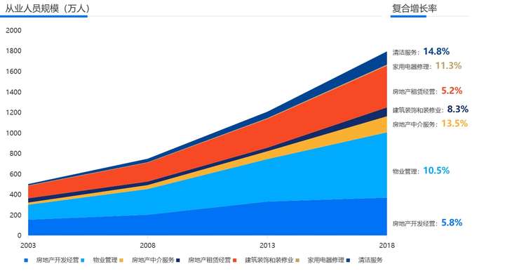 居住服务业处于就业“上升通道”《报告》认为,需求增长和产业结构调整,居住服务业从业规模不断提升。国家统计局数据显示,仅法人单位就业的居住服务者超1800万,占全国总单位就业规模的5%。值得注意的是,随着产业结构逐渐向第三产业转移,居住服务业就业贡献率由2003年的2.4%上升至2018年的5%。