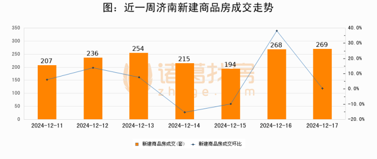 根据济南市住房和城乡建设局数据显示,2024年12月17日济南新建商品房成交269套,较昨日增加1套,环比上涨0.4%