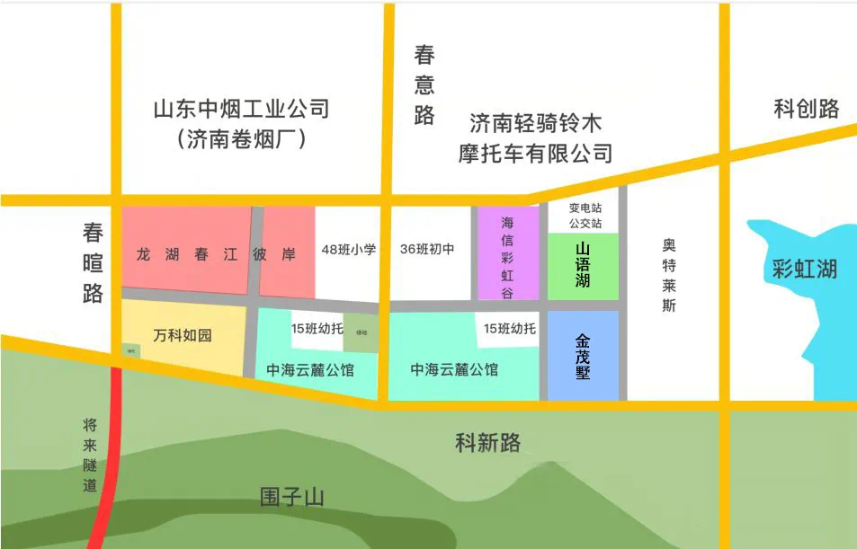 孙村片区科创路西侧、世纪大道两侧A-1至A-3地块,3个地块,由济高控股、建邦集团、融创中国共同联合打造,项目为烯谷国际中心孙村片区飞跃大道北侧,春秀路西侧地块A,万科、海信共同开发,项目为劝学里。是片区内排名前列个限价地块。老项目:碧桂园翡翠雅郡、融创望岳府一句话:基本每个楼盘都有实地踩盘,点击楼盘链接查看在售信息——楼盘产品类型丰富,可选择性多碧桂园翡翠雅郡刚需盘,以高层为主,价格低,均价约10300元/㎡。烯谷国际中心为刚需楼盘,目前已开盘,毛坯房,高层9500-11000元/㎡,小高层11300元/㎡。劝学里在唐冶与孙村的边界,为限价地块。目前毛坯限价房销售,限价12000元/㎡。海信彩虹谷、龙湖春江彼岸小高层、洋房为主,价格在12000元/㎡左右。金茂墅、万科如园为叠拼别墅,价格区间为265-450万/套。中海云麓公馆未叠拼、洋房产品,别墅价格280-500万/套,洋房约12000-13000元/㎡。山语湖为小高层、叠拼别墅,叠拼未开盘,小高层价格约12000元/㎡。融创望岳府现房别墅,已是尾盘销售。项目除山语湖为2022年6月交房,其余楼盘基本都在2021年6月份交房,届时入住率提升,片区内的“烟火气”将提升。孙村片区目前仍处于发展中,与“成熟”仍存在差距孙村片区被定义为城市次中心,片区大力发展,影响力逐渐扩大。道路的通畅让孙村拉短了与市区的距离,配套的完善留住了生活的脚步,一切变的越来越美好。但是,不可否认的是孙村片区仍处于发展中,与购房者期望的生活仍然存在差距。交通:主干道世纪大道、春晖路,以及周边的道路交通网已形成。并且新增2条隧道,南北向春暄路南延,穿越玉皇山,直达经十路,工程已开工;东西向科创路西延,穿越围子山路,直通唐冶佑安街,规划中尚未开工。配套:1、彩虹湖、围子山、玉皇山1、百联奥特莱斯已开业2、彩虹湖的西南角、孙村立交的东北角,有创意岛项目,是高新东区核心区的功能中心,规划布置商业购物、商务办公、高端酒店等
