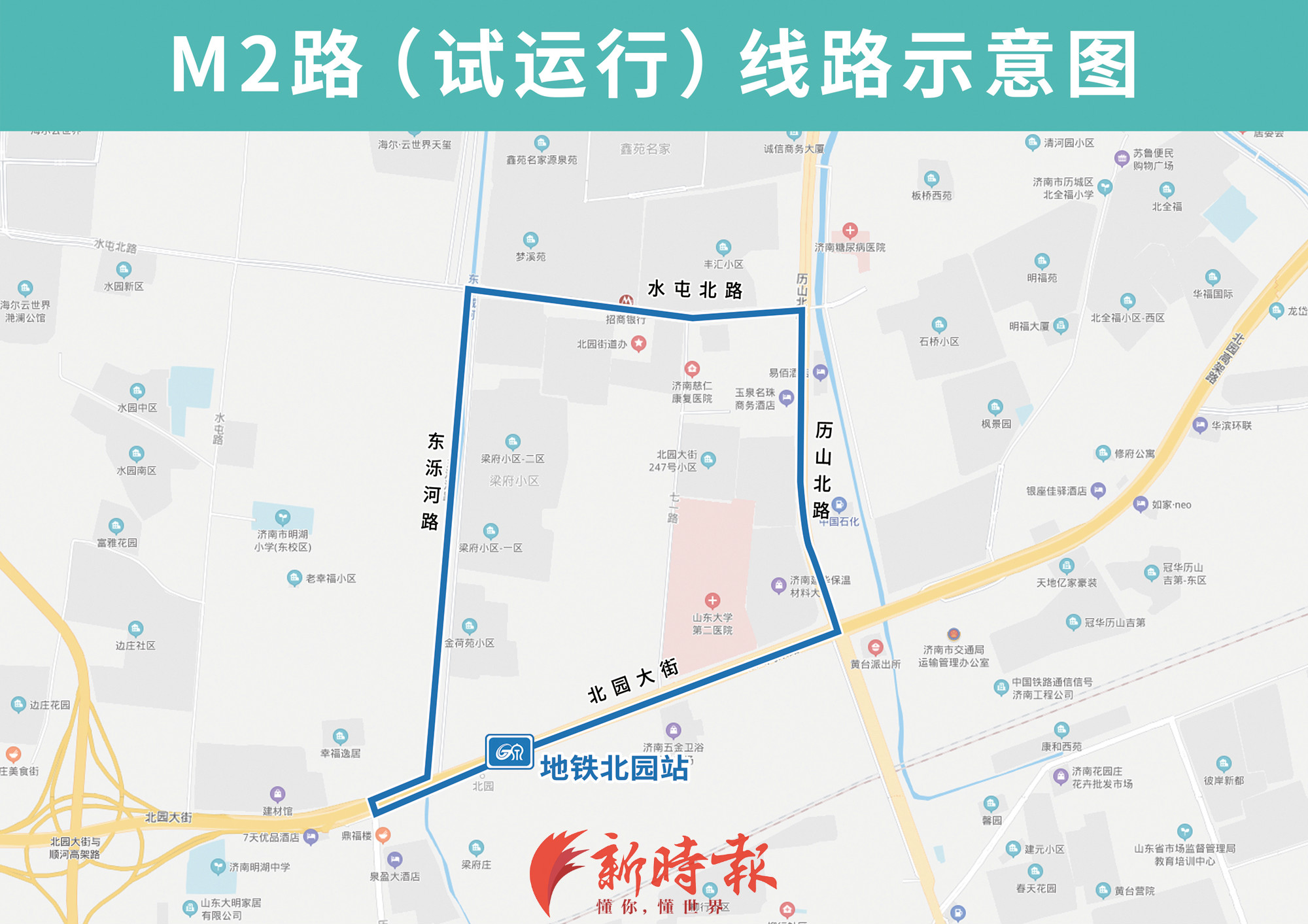 地铁接驳专线M2路,途经北园大街、历山北路、水屯北路、东泺河路,方便石桥小区、鑫苑名家、梁府小区等小区居民接驳换乘。