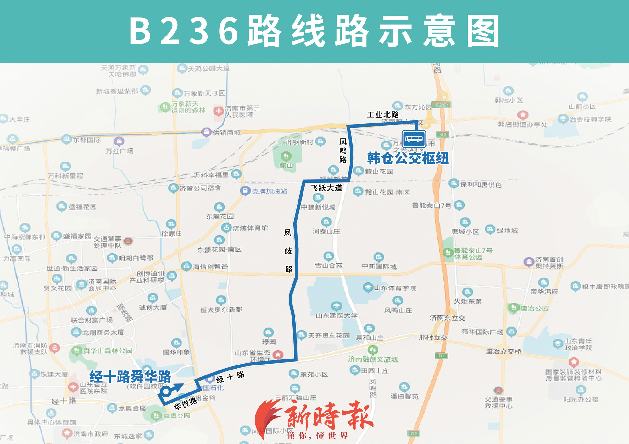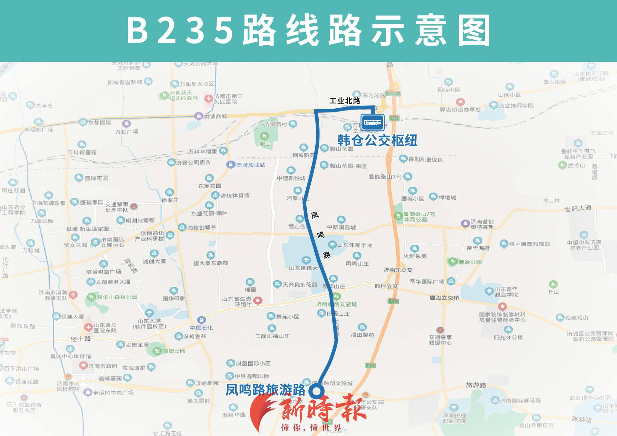 常规线路分别为:B235路由韩仓公交枢纽开往凤鸣路、旅游路,主要途经工业北路、凤鸣路,填补凤鸣路路段公交少有;B236路由韩仓公交枢纽开往经十路舜华路,主要途经工业北路、凤鸣路、飞跃大道、凤歧路、经十路、凤凰路、华悦路、舜华南路,填补凤歧路、华悦路等路段公交少有。