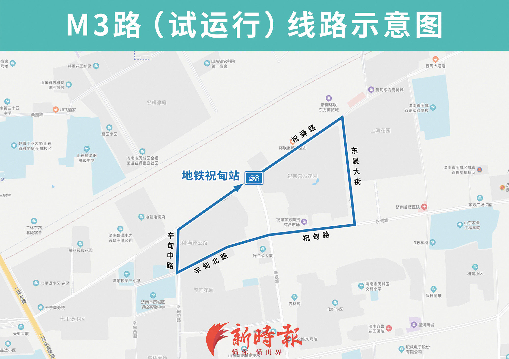 地铁接驳专线M3路,途经祝舜路、东晨大街、祝甸路、辛甸北路、辛甸中路,方便祝甸东方花园、保利海德公馆、辛甸花园等小区居民接驳换乘。