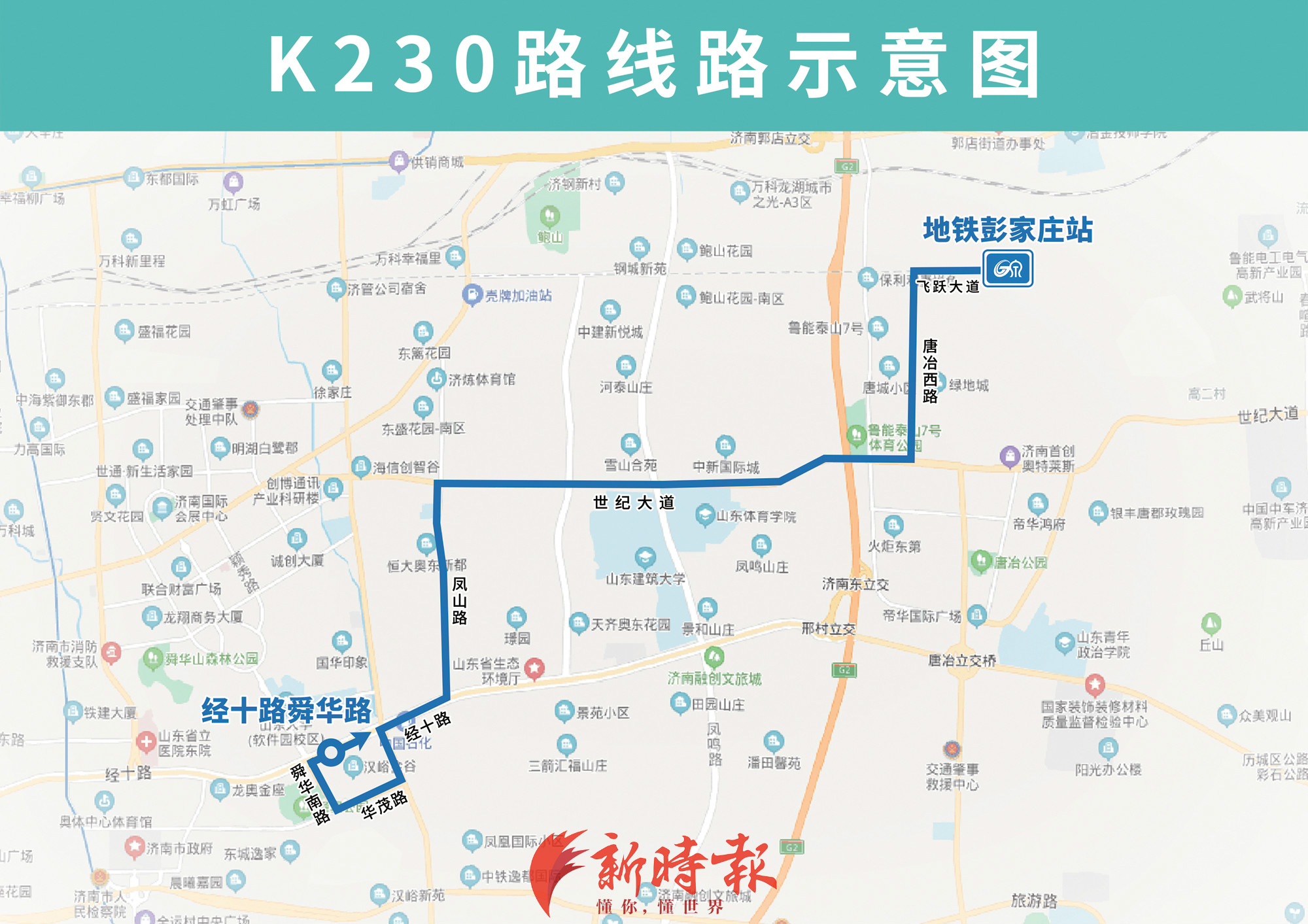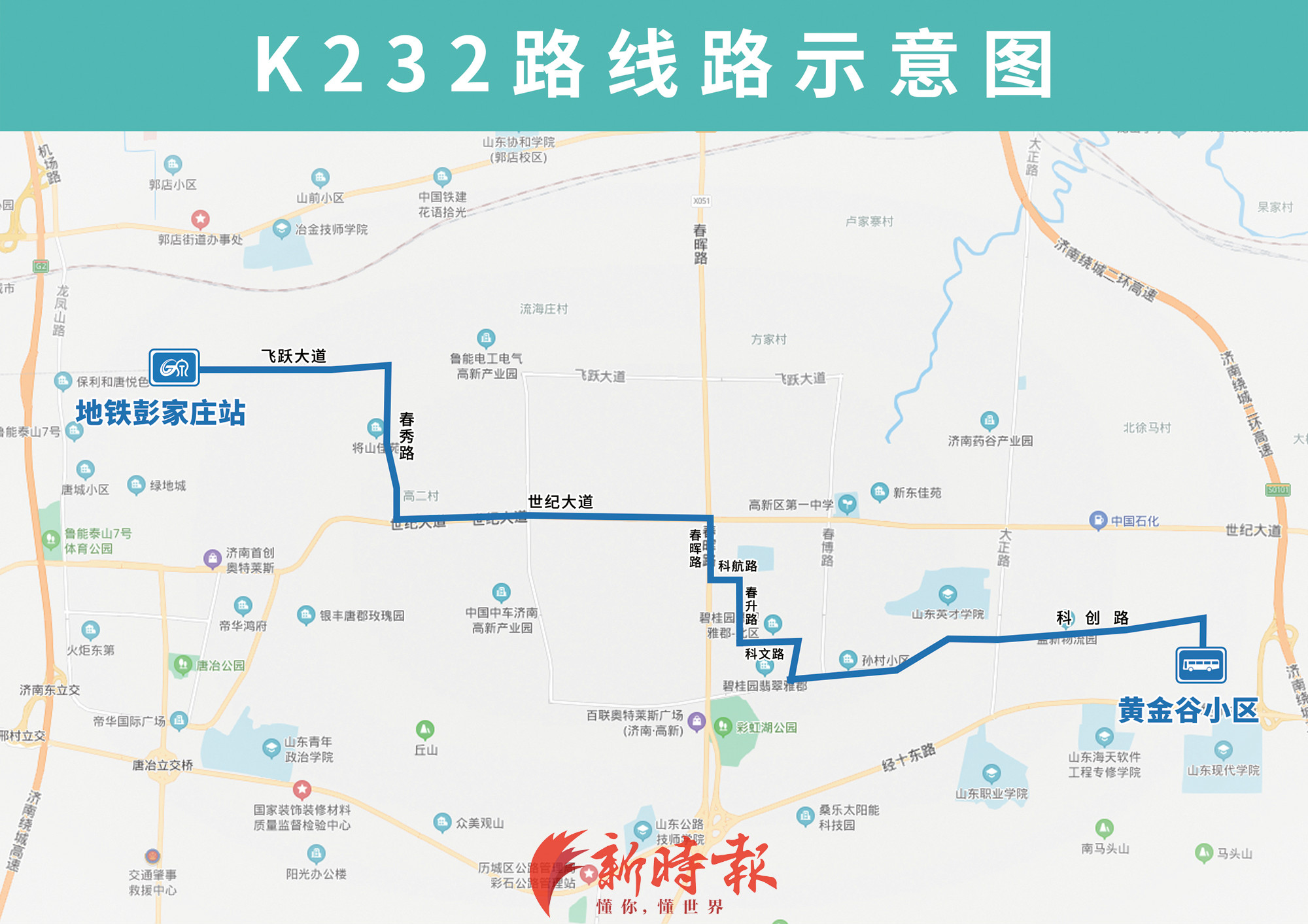 常规线路分别为:K232路由地铁彭家庄站开往黄金谷小区,主要途经飞跃大道、春秀路、世纪大道、春晖路、科航路、春升路、科文路、左家洼西侧道路、科创路,填补科创路、科文路、春升路等路段公交少有;K230路由地铁彭家庄站开往经十路舜华路,主要途经飞跃大道、唐冶西路、世纪大道、凤山路、经十路、凤凰路、华茂路、舜华南路,填补凤山路、华茂路等路段公交少有。