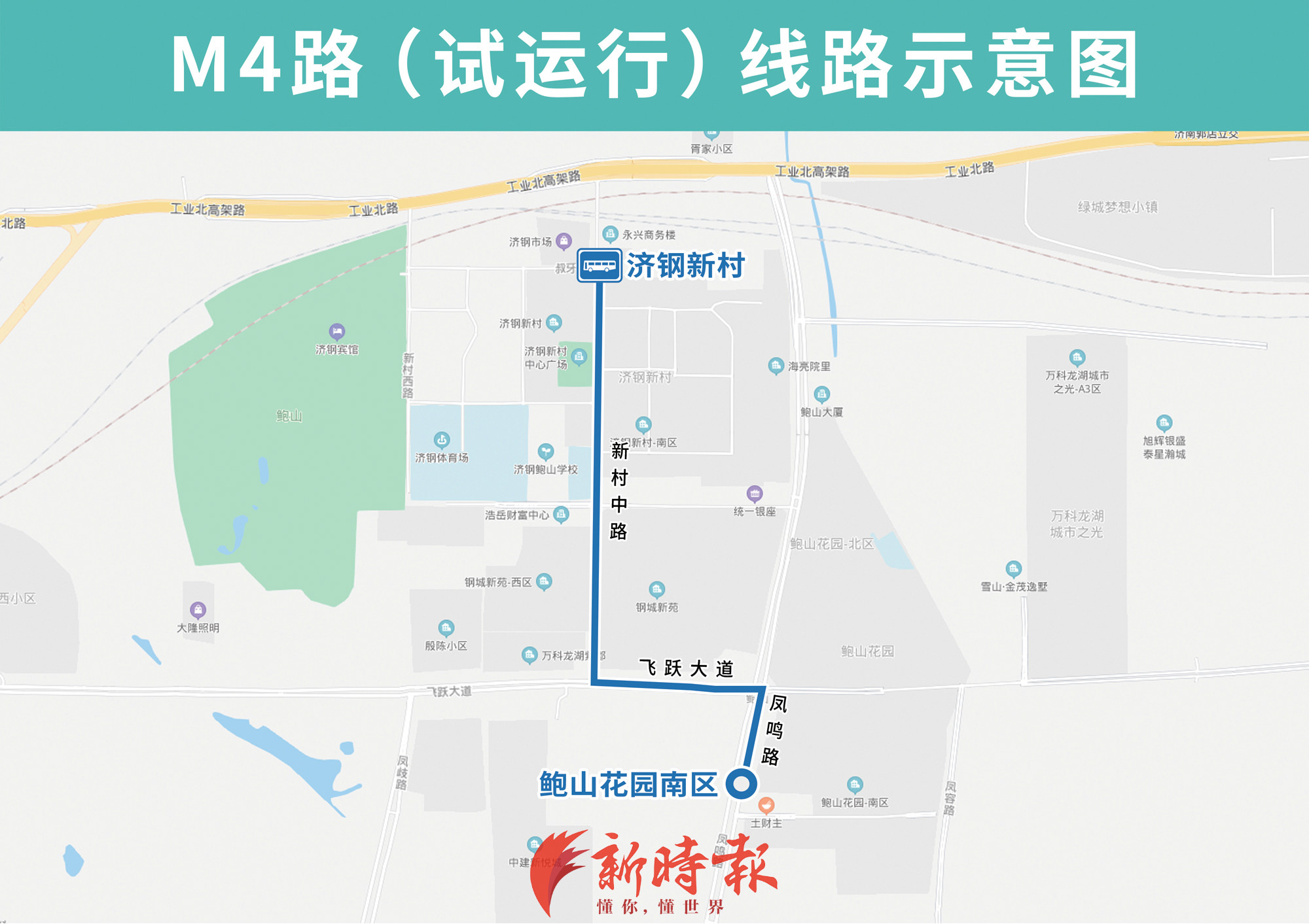 地铁接驳专线M4路由济钢新村开往鲍山花园南区,方便济钢新村、钢城新苑、鲍山花园等小区居民接驳换乘。