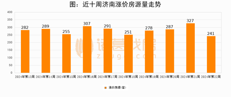 从调价房源来看,第22周济南涨价房源241套,较上周下降26.3%。与此同时,22周涨价房源占比回落0.73个百分点,业主信心小幅波动,购房者可则需入市。