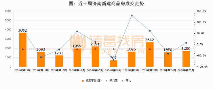进入2024年第22周(05月27日-06月02日),济南新建商品房成交1700套,较上周增加130套,环比上涨8.3%