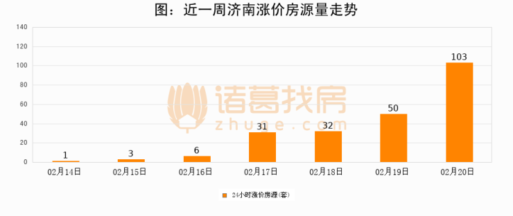 根据诸葛找房数据显示,济南24小时涨价房源量为103套,较02月19日增加53套,环比上涨106%。与此同时,涨价房源占比小幅扩大,业主信心有所提升。