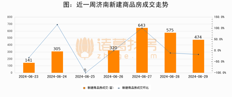 根据济南市住房和城乡建设局数据显示,2024年06月29日济南新建商品房成交474套,较昨日减少101套,环比下降17.6%