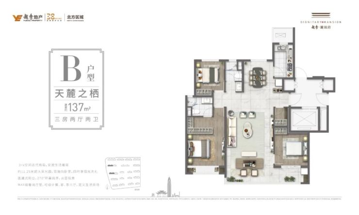 建筑面积约137㎡产品,三开间朝南,两个南向卧室+北面一个百变房间,再加上整体约11.25米的朗阔面宽,堪称三房户型中的战斗机。