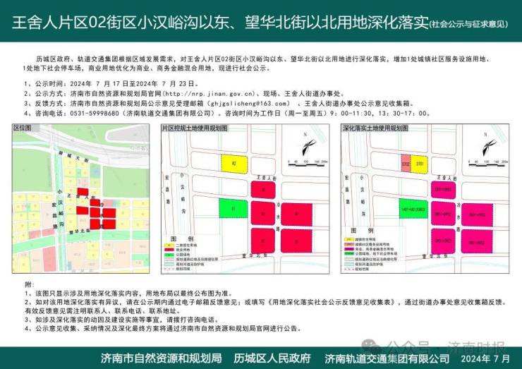 历城区政府、轨道交通集团根据区域发展需求,对王舍人片区02街区小汉峪沟以东、望华北街以北用地进行深化落实,增加1处城镇社区服务设施用地、1处地下社会停车场,商业用地优化为商业、商务金融混合用地,现进行社会公示。