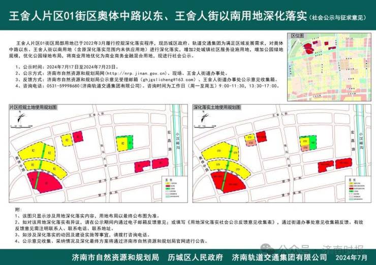 王舍人片区01街区局部用地已于2022年3月履行控规深化落实程序,现历城区政府、轨道交通集团为满足区域发展需求,对奥体中路以东、王舍人街以南用地(含原深化落实范围内未供应用地)进行深化落实,增加2处城镇社区服务设施用地,增加公园绿地规模,优化公园绿地布局,将商业用地优化为商业商务金融混合用地,现进行社会公示。