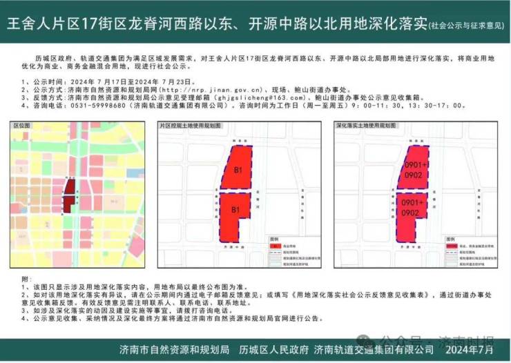 历城区政府、轨道交通集团为满足区域发展需求,对王舍人片区17街区龙脊河西路以东、开源中路以北局部用地进行深化落实,将商业用地优化为商业、商务金融混合用地,现进行社会公示。
