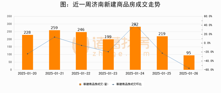 根据济南市住房和城乡建设局数据显示,2025年01月26日济南新建商品房成交95套,较昨日减少124套,环比下降56.6%