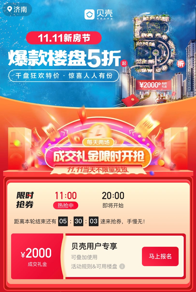 买东西,讲究的是快准狠。一犹豫,秒杀优惠通通溜走。11月5日,贝壳济南站“11.11新房节”活动正式上线,携手恒大、龙湖、中铁、万科等数十个品牌房企,共计超100套优惠好房参与活动;同时贝壳还推出5折特价房秒杀、6折好房抢购、专属成交津贴、大额红包抽奖等活动。
