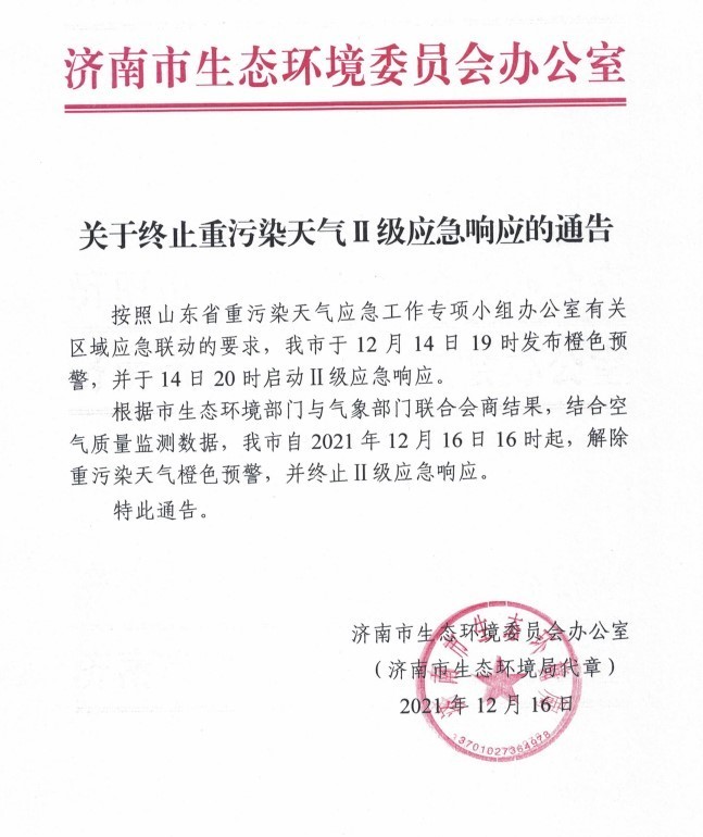 根据市生态环境部门与气象部门联合会商结果,结合空气质量监测数据,我市自2021年12月16日16时起,解除重污染天气橙色预警,并终止Ⅱ级应急响应。