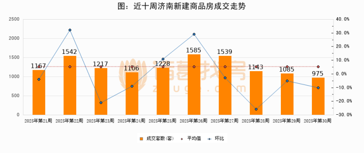 进入2025年第30周(07月21日-07月27日),济南新建商品房成交975套,较上周减少110套,环比下降10.1%