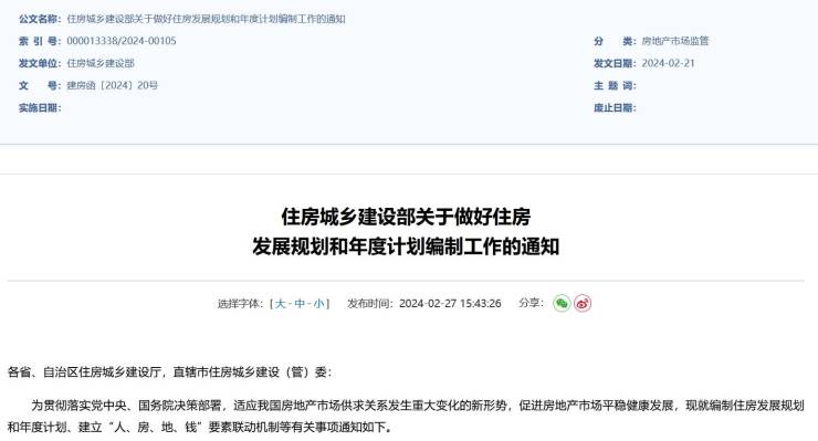 住建部表示,住房发展规划和年度计划是建立“人、房、地、钱”要素联动机制的重要抓手。各地要充分认识做好住房发展规划和年度计划的编制实施工作的重要性,科学编制规划,认真组织实施,根据人口变化确定住房需求,根据住房需求科学安排土地供应、引导配置金融资源,实现以人定房,以房定地、以房定钱,促进房地产市场供需平衡、结构合理,防止市场大起大落。